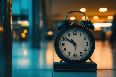 An antique alarm clock stands on a table at a bustling train station, capturing evening lights and motion.