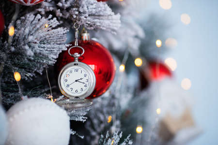 Vintage silver clock hanging on decorated Christmas tree with blurred bokeh background. Winter New Year card with copy space.