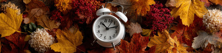 Alarm clock placed among colorful autumn leaves and flowers, evoking a warm seasonal ambiance, representing the transition of time and nature's beauty