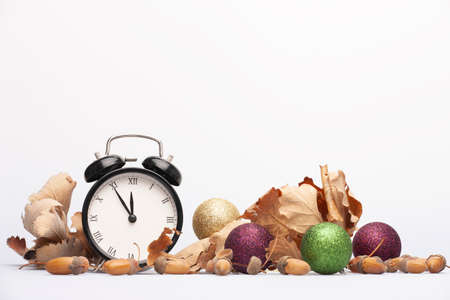 Composition of clock and christmas decorations on bright background. Card