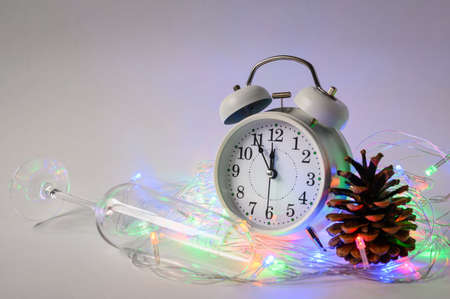 Alarm clock with a garland next to an empty glass on Christmas night. Selective focus on alarm clock