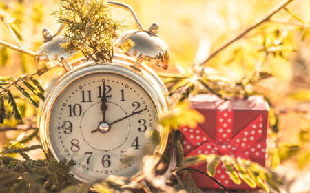 Waiting for the new year. Clock with an alarm clock and a gift. Happy New Year. Christmas presents.