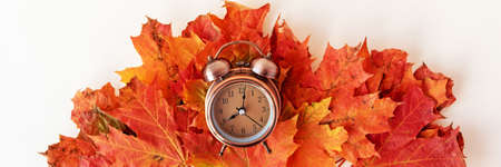 Top view of old fashioned alarm clock on pile of autumn orange maple leaves. Banner for website or page. Fall season with lush colorful foliage, composition of withering flora and watch on white