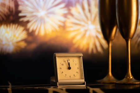 clock at midnight and fireworks New Year's eve celebration