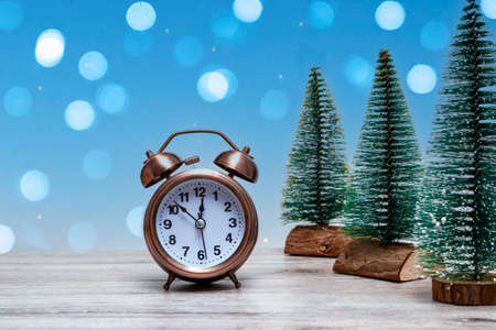 Christmas background with small Christmas trees and vintage alarm clock on a wooden background with lights. Close up Christmas theme