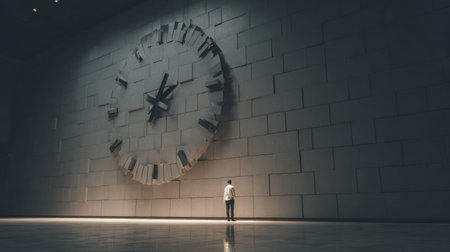 A person looks at a giant wall clock in a spacious area, focusing on its depiction of time and scale around them.