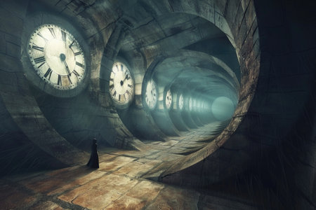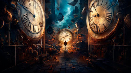 Lonely wanderer in timeless corridor with infinite clocks, exploring continuity of moments AI