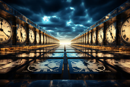 A surreal image of a long hallway with retro clocks showing different times, creating a sense of time distortion and mystery under a dark blue sky.
