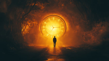 A lone figure walks towards a large glowing clock in a mystical forest at night. The scene evokes a sense of mystery and contemplation.