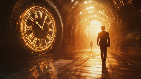 Two silhouetted figures walk towards a radiant archway in a mystical tunnel, a giant golden clock nearby. A journey through time and uncertainty.