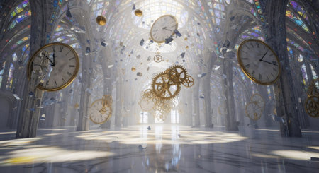 A surreal scene featuring clocks and gears suspended in a luminous, cathedral-like hall, creating a dreamlike atmosphere of time and space.