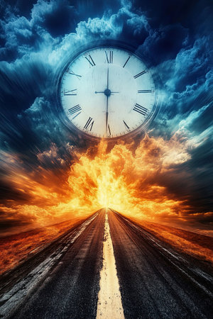 Time. An irreversible current flowing in only one direction, from past, through present to the future. Hourglass, seconds, clock, abstract eternity. Disappears and falls into oblivion. Generative AI.