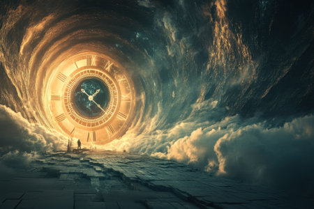 A captivating clock emerges from dense clouds, symbolizing the passage of time and the endless journey of life.