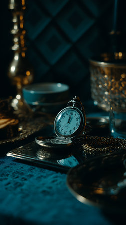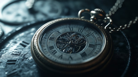 Intricate antique pocket watch resting on an old wooden surface, illuminated by soft light in a vintage setting