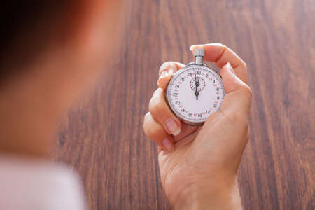 Hand holding stopwatch for precise time measurement in simple composition setup shows concept of accuracy, efficiency, and time management in everyday tasks.