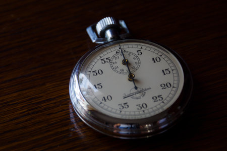 Retro stopwatch is on a wooden table