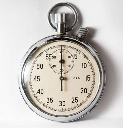 A historic old metal stopwatch is shown in the picture on a white background