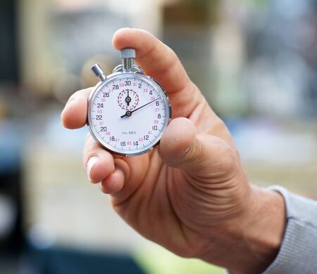 mechanical stopwatch in hand. Time part precision. Measuring the speed interval with a watch
