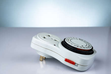 Plug-in timer mechanical 24 hour. Indoor home tools. Plug-in timer socket set isolated on gradient background. Mechanical outlet timer. Home security supply. Smart home tools. Mechanical timer switch.