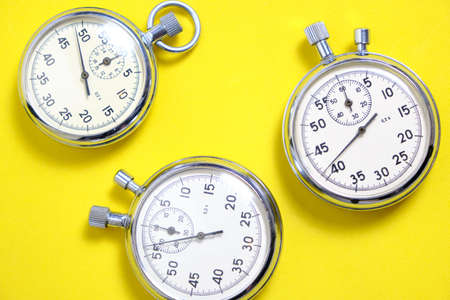 Three mechanical stopwatches on a yellow background
