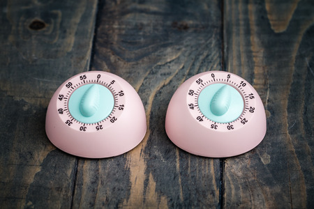 Pink kitchen cooking timer on blue wooden background