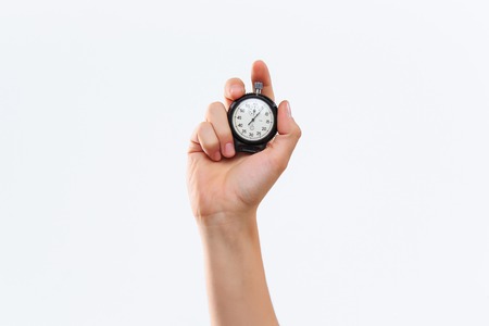 The male hand holding a stopwatch against a white background