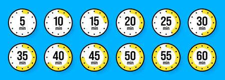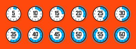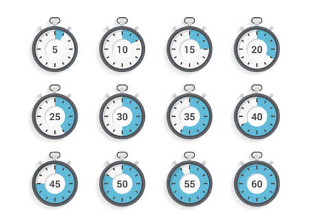 Timer and stopwatch icon set. Countdown timer with different time. Kitchen stopwatch symbol for cooking or sports clock with minutes. Vector illustration.