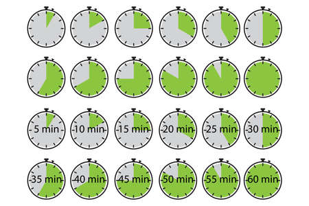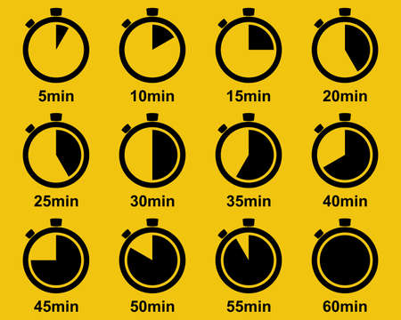 Timer set black silhouette icons. Stopwatch 5, 10, 15, 20, 25, 30, 35, 40, 45, 50, 55, 60 minutes. Time clock icon collection. Half and quarter of hour. Template chronometer.