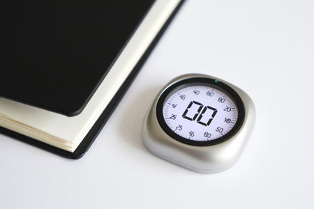 Electronic timer showing zero. Black notebook. White surface preparation concept