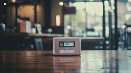 A modern digital timer placed on a wooden cafe table, capturing a serene atmosphere with soft light and a stylish interior design. Ideal for culinary and decor themes.