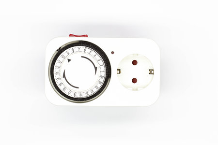 Socket timer. Energy saving concept. Electrical Timer. Electromechanical device for a socket with a time scale and a toggle switch. Power supply to devices on time. Electric socket