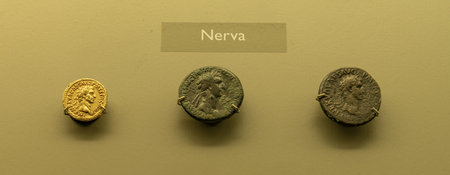 Display of ancient Roman coins featuring Emperor Nerva at the Merida Museum, Spain, highlighting the numismatic history and portraits of the Roman Emperor.
