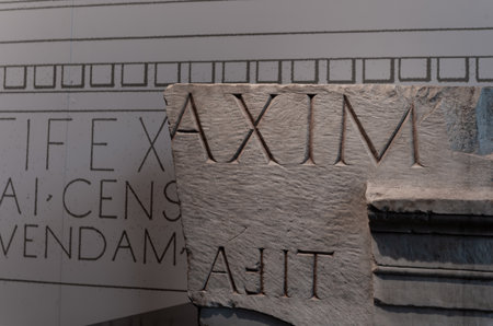 Rome Italy - April 16 2011; Part of wall with Old Roman text engraved in stone.