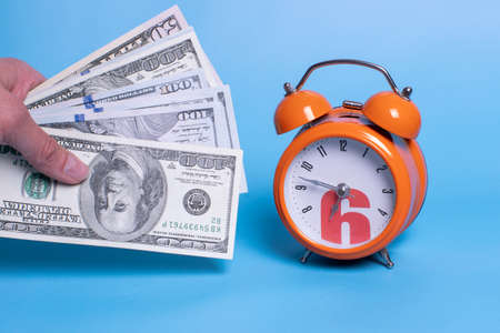 Hand holding money next to orange alarm clock. Concept for business planning, finance, savings, tax.