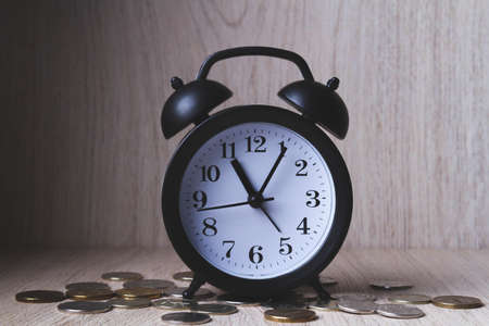 Alarm clock and money. Time is money. Coins on the background of the clock. Money leak. Payment of time according to the price.