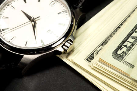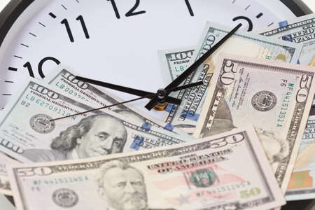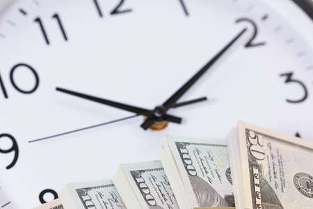 Time is money clock concept. Dollar bills on the dial of the clock with arrows