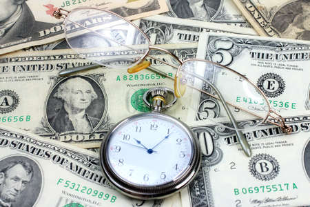 A pocket watch, or clock, timepiece on a pile of cash. Good use for any financial inference where time is a factor of money