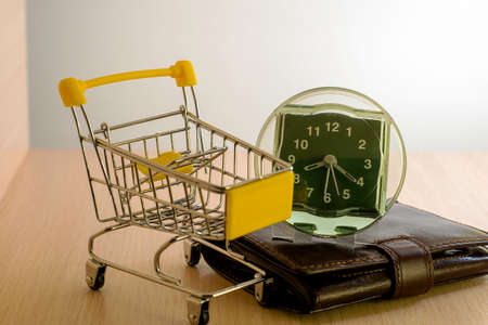 shopping cart wallet and watch on the shelf concept shopping time. High quality photo