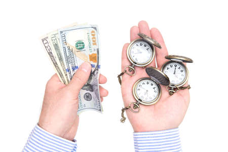 Crop view of male hands holding pocket watches in one hand and and dollar bills in the other isolated on white. Time investment concept.