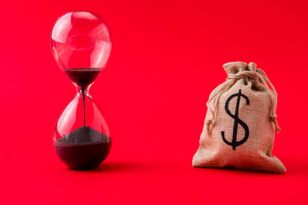 Close-up view of moneybag account market management stocks, shares rate running out of time sand clock counting isolated over bright vivid shine vibrant red color background