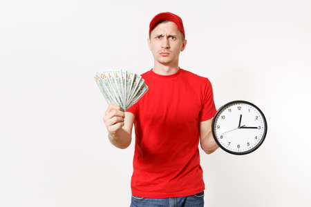 Delivery man in red uniform isolated on white background. Smiling male in cap, t-shirt, jeans working as courier or dealer, holding bundle of dollars cash money, clock. Copy space for advertisement