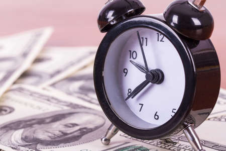 Finance concept, alarm clock and one hundred dollar banknotes on wooden table.