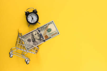 Mini shopping cart with 100 dollar banknotes inside and mini alarm clock on yellow background. Trolley and money. Financial crisis or shopaholic concept. Flat lay, copy space.