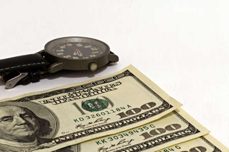Money and stopwatch. Bundles of dollar banknotes and a stopwatch. Time is money. Concept of how to get rich quickly