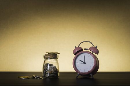 Clock over jar of gold coins. Money and time concept. Copy space for text or logo.