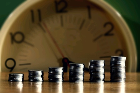 Step of coins stacks and alarm clock with tablet computer and financial graph, business planning vision and finance analysis concept idea.