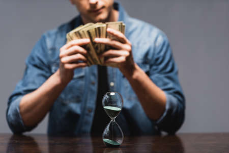 Selective focus of hourglass near man holding dollars while sitting at table isolated on gray, concept of time management
