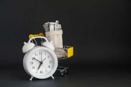 A white alarm clock and shopping basket with a canvas bag full of money on a dark isolated background. Time shopping, the market, the concept of the consumer. Close-up, copy space.