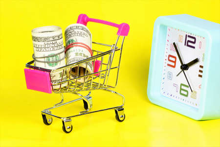 Cash dollars in a shopping cart, against the clock. Planning shopping in stores.