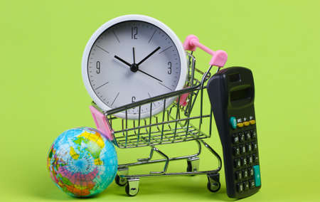School supplies with a sopping trolley on green background. Shopping cart, globe, calculator, clock. shopping time
